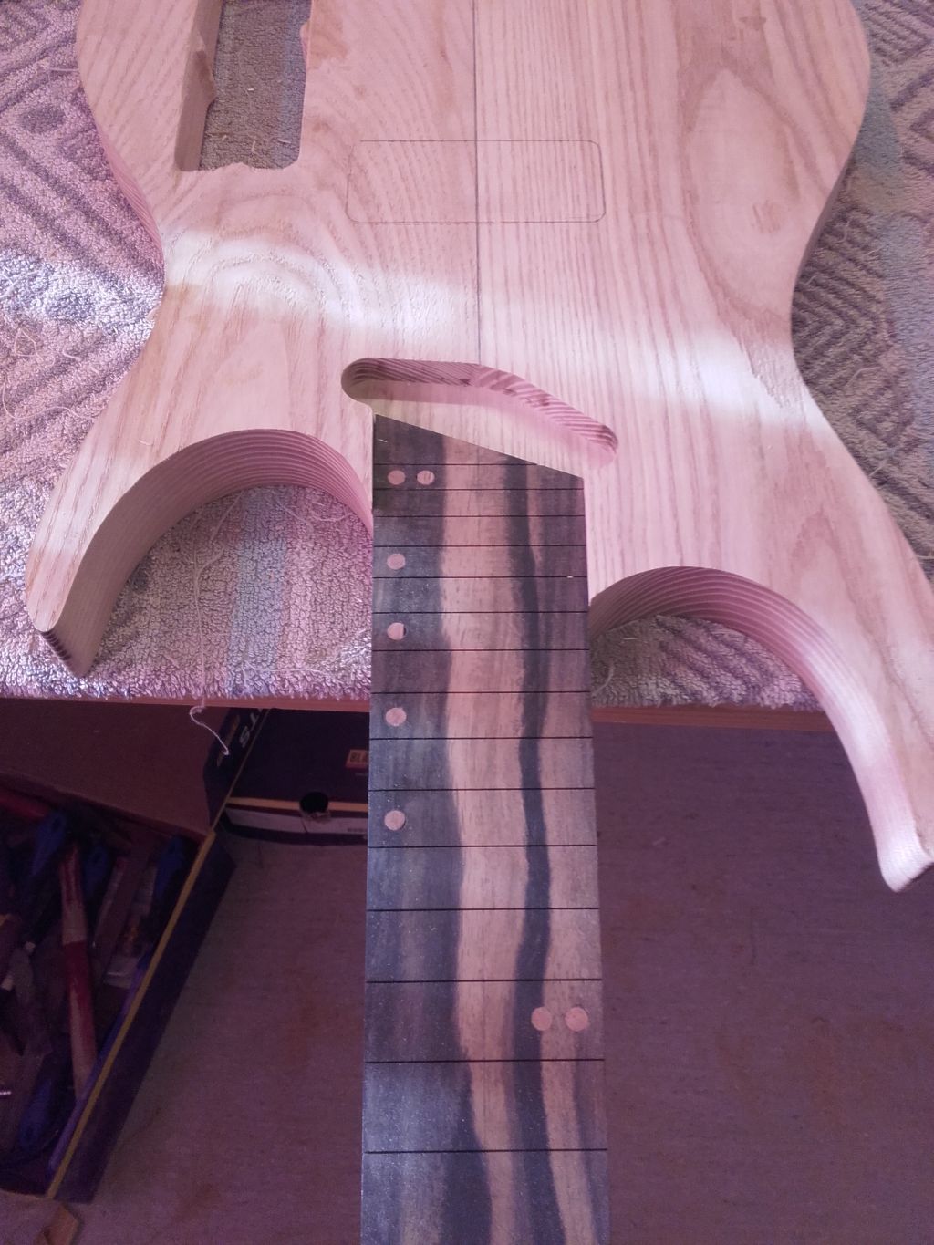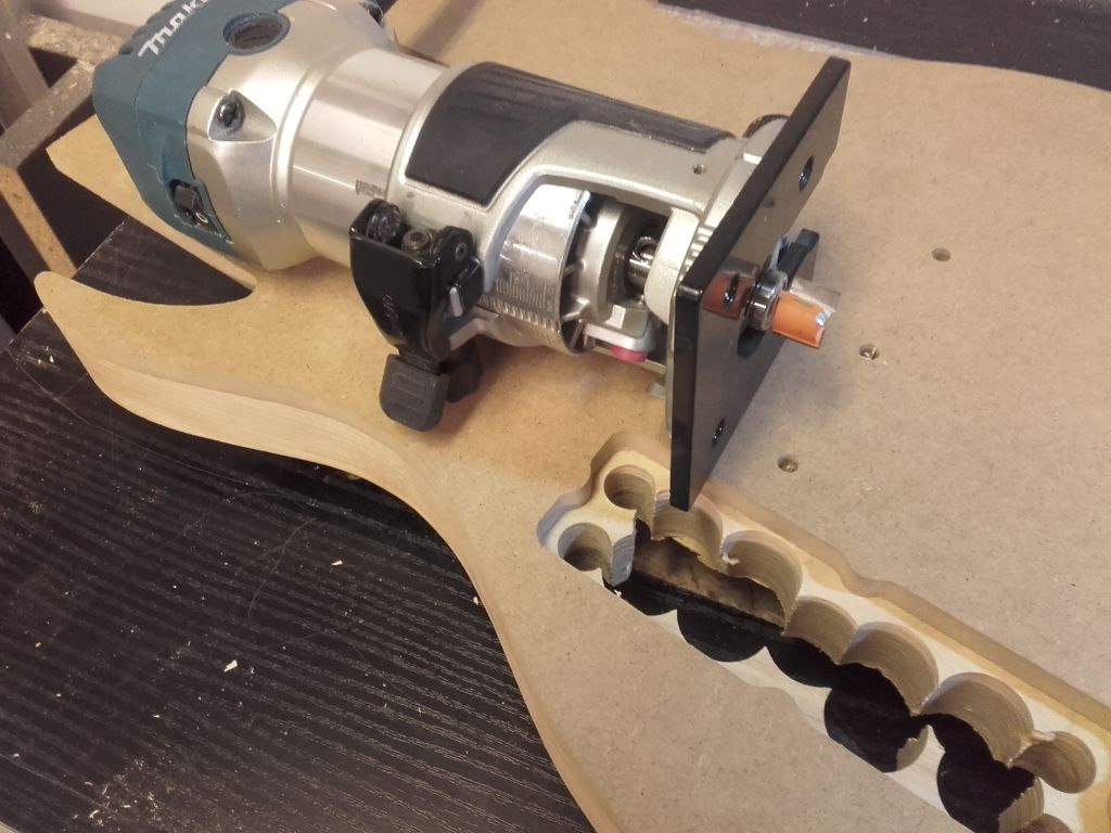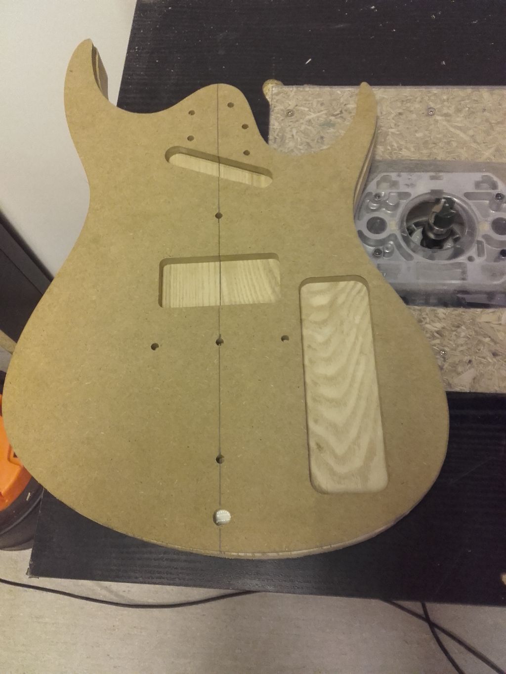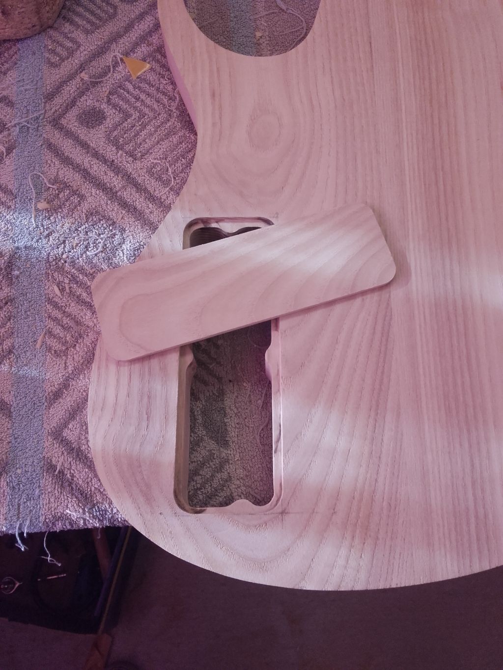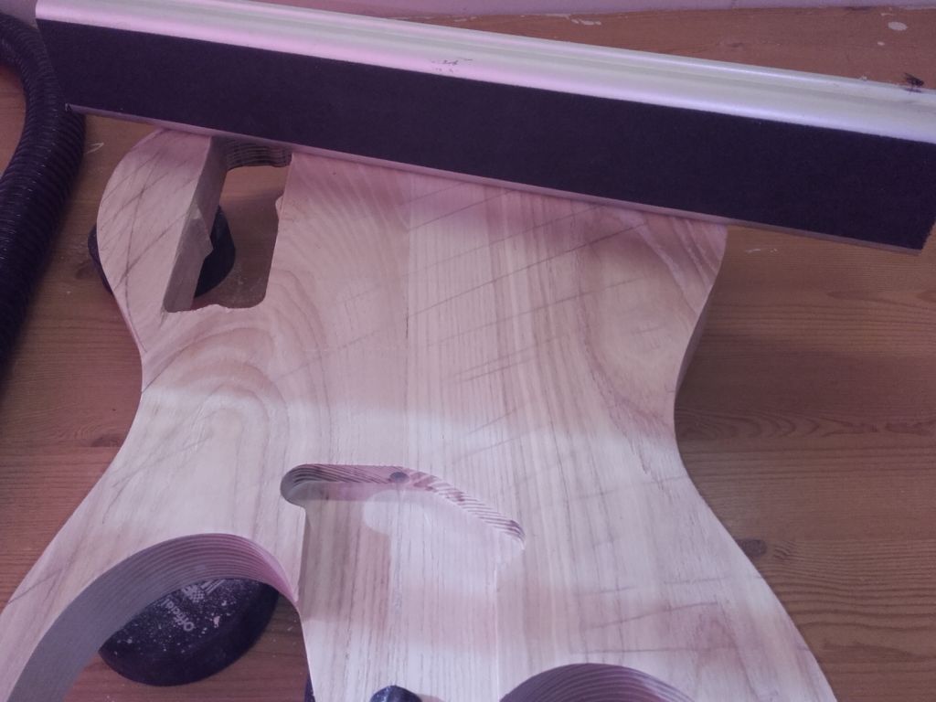 Po wyfrezowaniu kieszeni gryfu zastanawiałem się czy nie lepiej było zrobię to już z topem. Bez topu sam trapez. Sam nie wiem.Wyjdzie w praniu jak odkręcę i zabiorę się za wyprowadzanie kieszeni na gotowo.