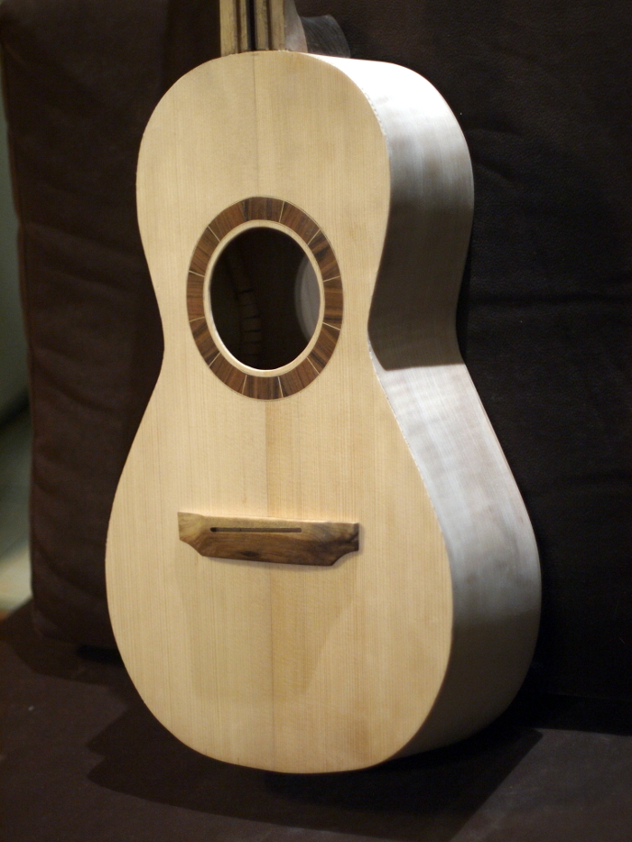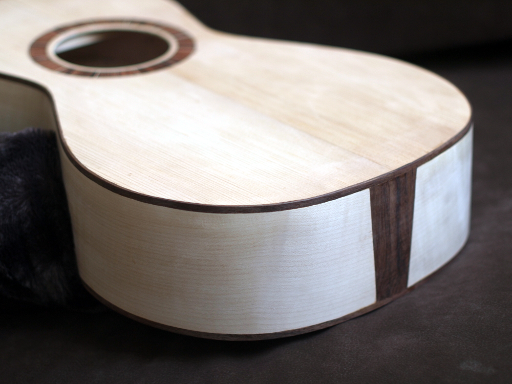 Boczki wygięte na grzałce, pieniek tylny jesionowy. Kerfing (tfu) - przy topie - wsporniczki z drewna samba, przy pleckach osika (listwa nacinana). Pod mostkiem wzmocnienie łwierkowe z nakładkę z padouka - dla ochrony przed wrzynaniem się kuleczek strun. Belkowanie - Martin.