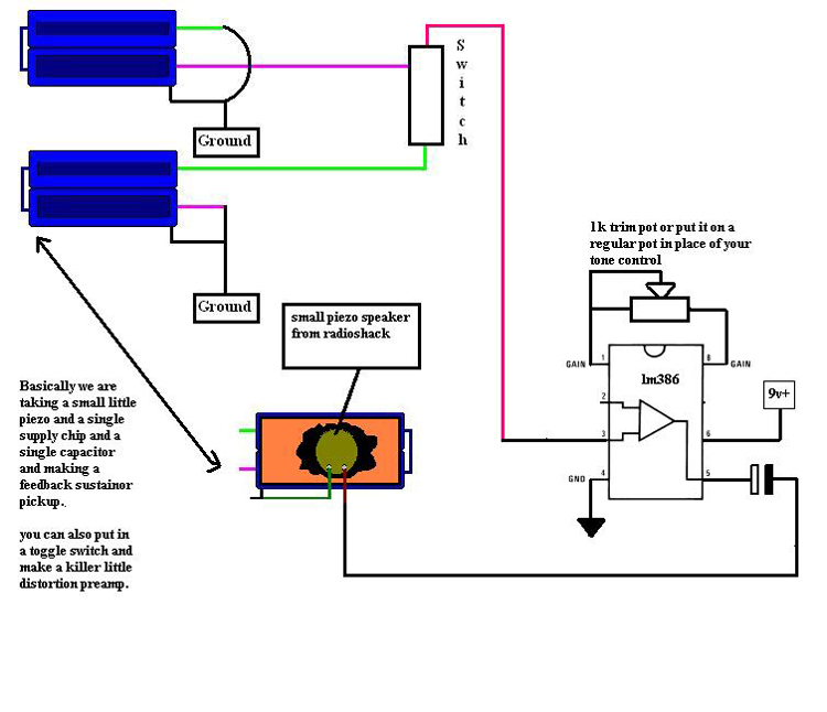 Działanie: z wyjscia gitary pobierany jest sygnał, wzmacniany w Op-Ampie i podawany na glosniczek piezo ktory ma pobudzac struny i wydluac ich drgania.
