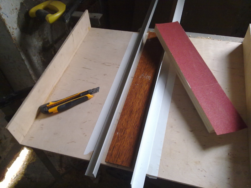 Szlifowałem długo. Nawet sobie z kętowników takie szyny zrobiłem, żeby mi klocek na boki nie chodził. Pomiędzy nimi deska na podstrunnicę. Wreszcie wyszedł mi odpowiedni profil na desce. Niestety... Okazało się, że wyprofilowałem nie tylko poprzeczne 12" ale i wzdłużnie.