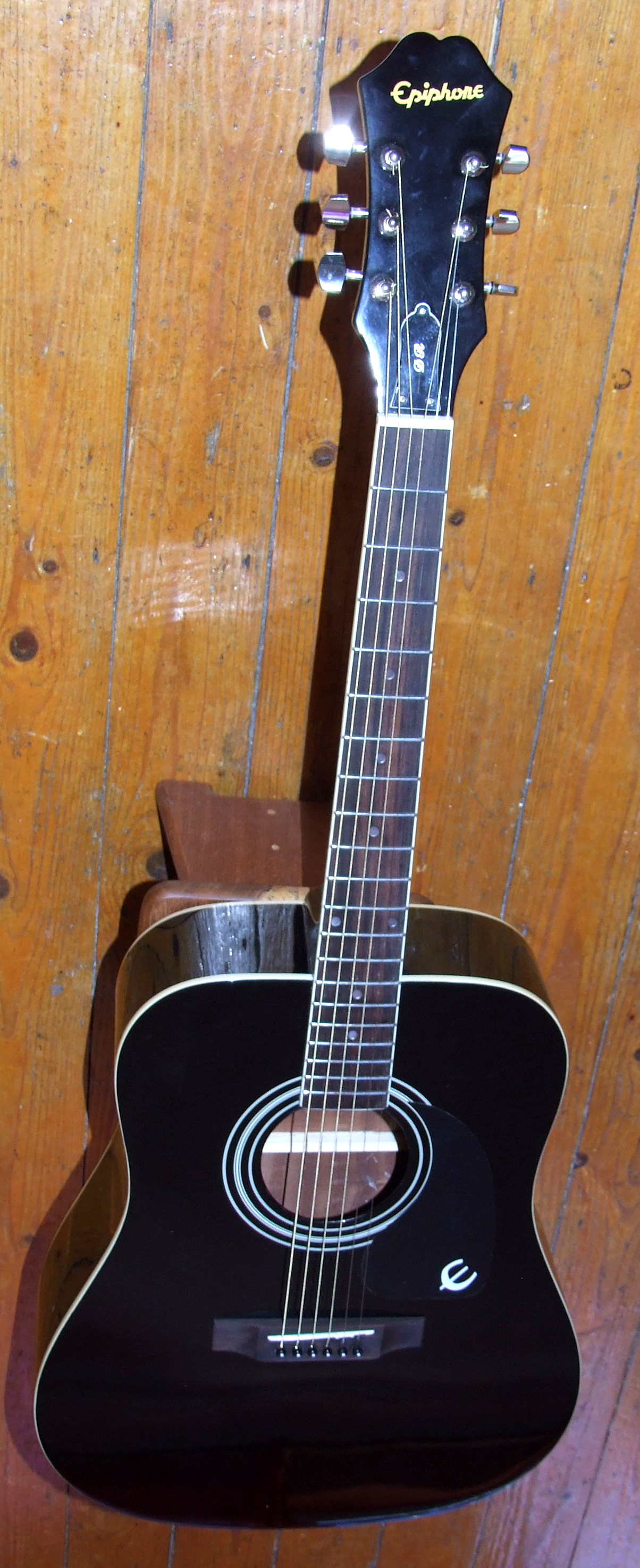 Gitara to akustyczny Epiphone z dolnej półki. Główka jest ułamana w linii siodełka, co ciekawe, nie po linii "scarf joint", tylko prostopadle do podstrunnicy. Czyli powierzchnia klejenia bardzo mała. Dodatkowo chyba były jakieł próby naprawy, bo widaę jakieł zanieczyszczenia, może łlady kleju.