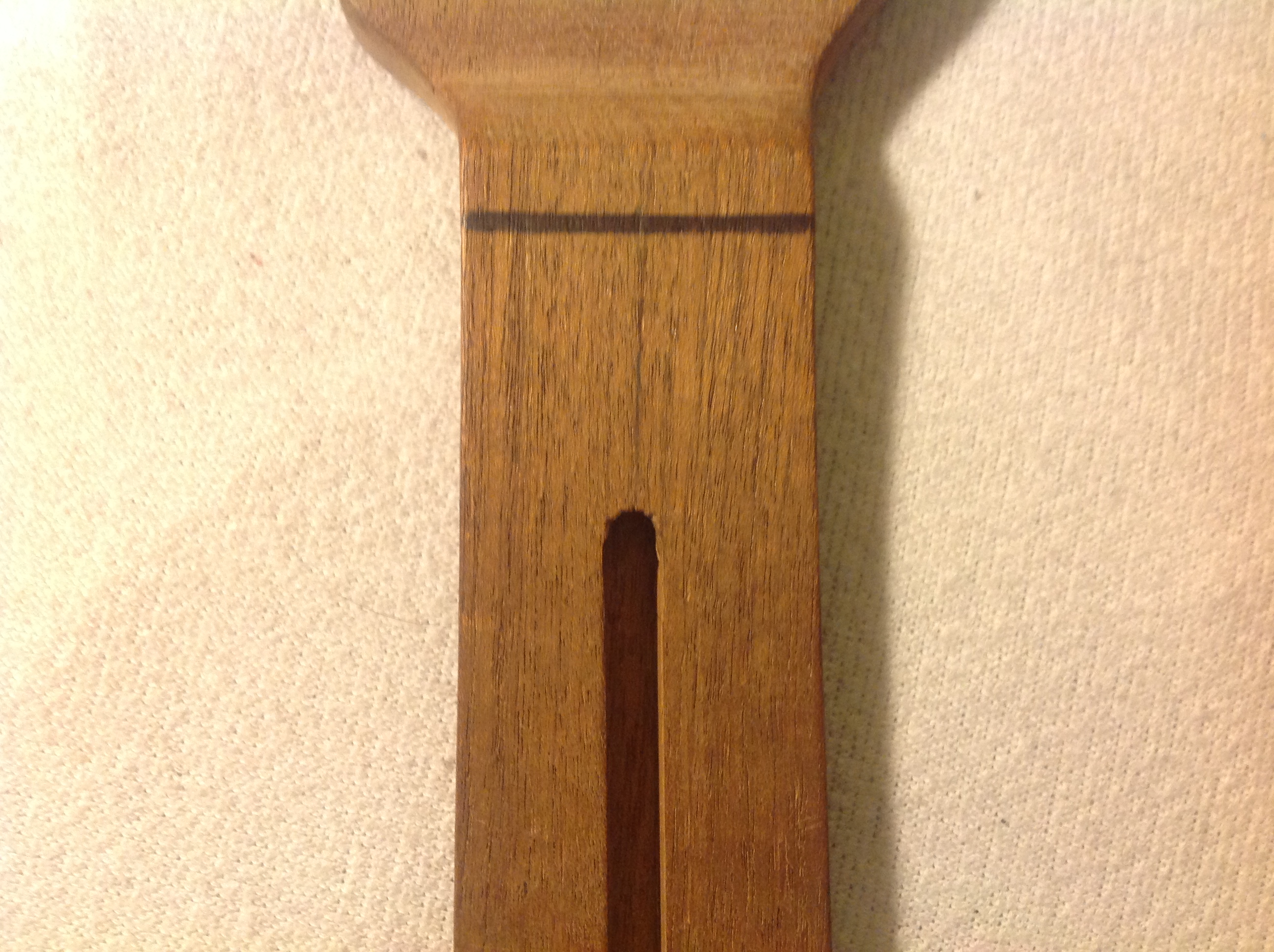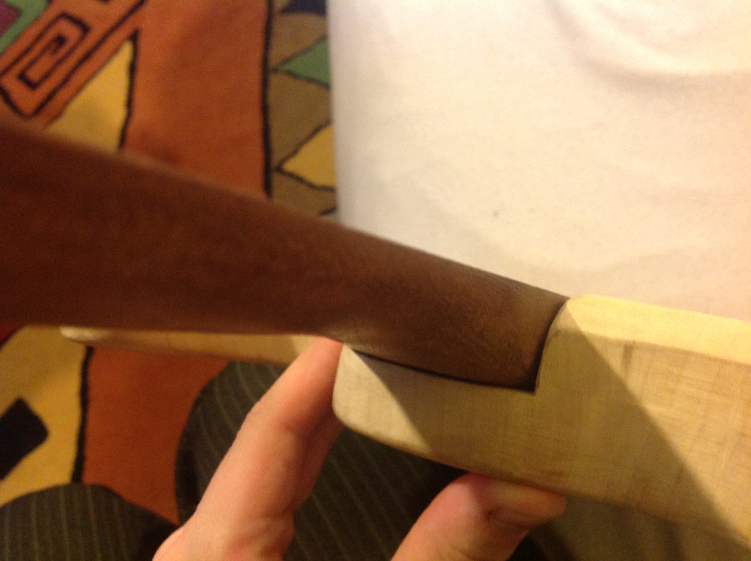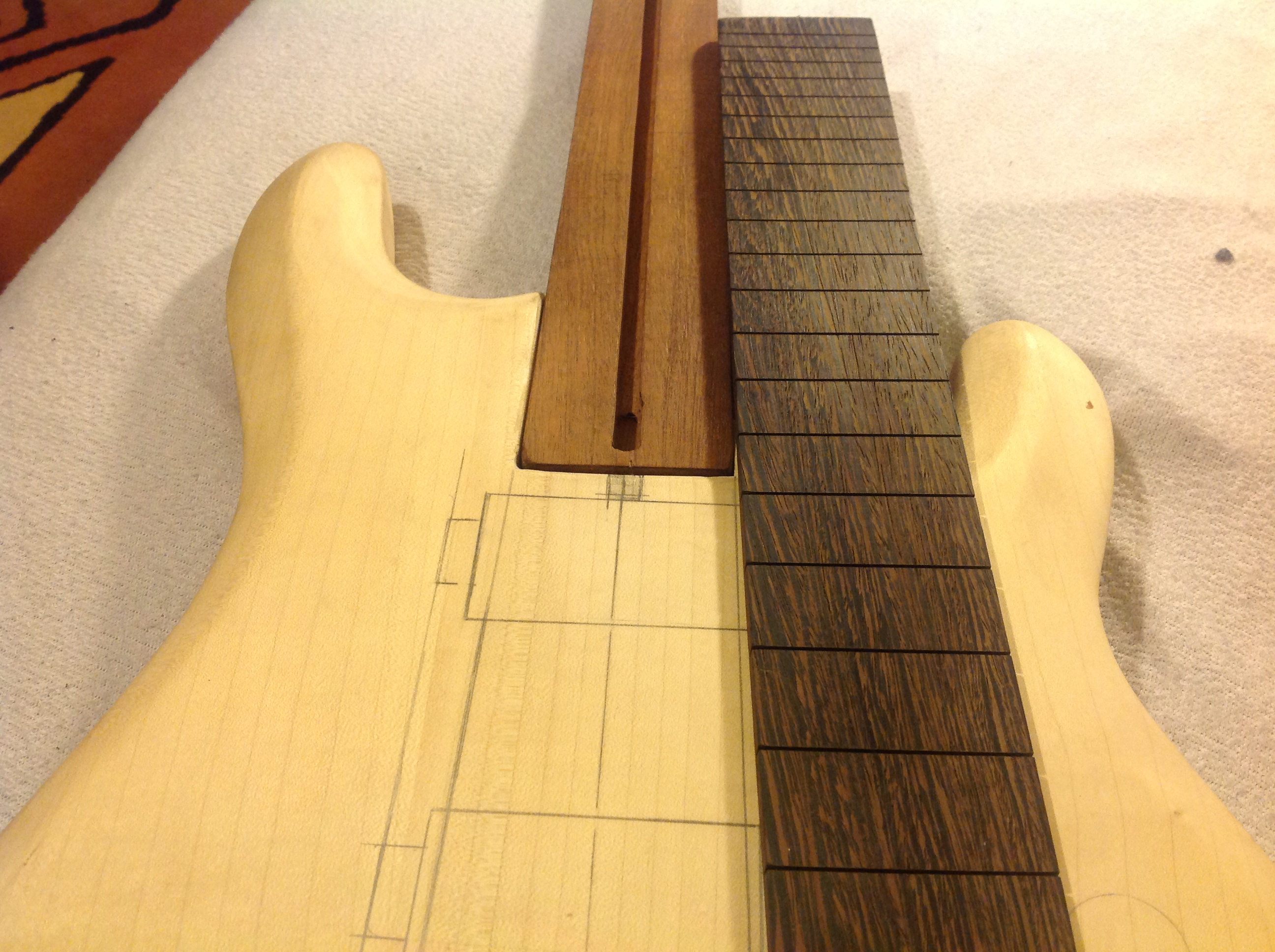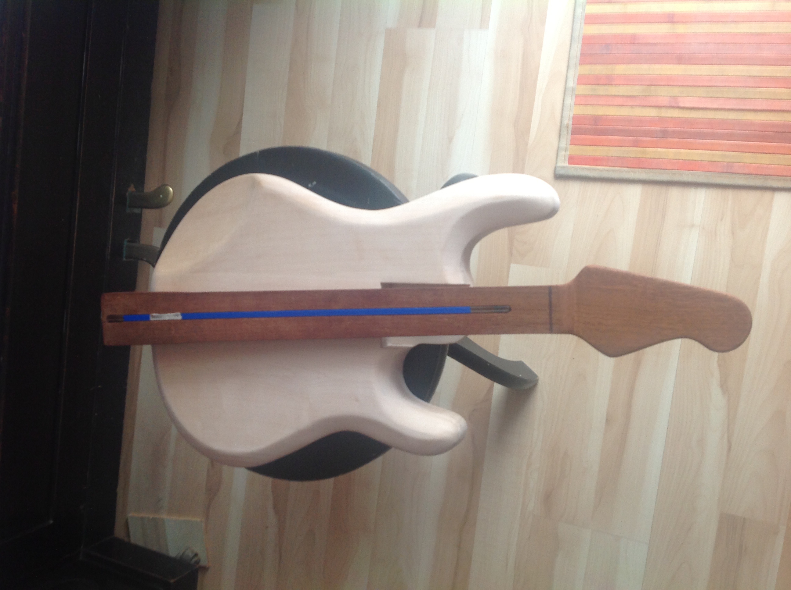 W kieszeni po bokach wklej na klej kostny dwie jednakowe listwy z tego materiału co korpus, które pozwolę na powtórne, poprawne wykonanie kieszeni na gryf. / może wystarczy jedna od strony większego przesunięcia względem osi/