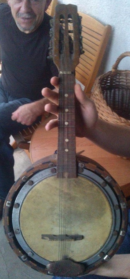 Instrument na zdjęciu to typowe Bandżo mandolinowe, łrednica max 8 cali, popularne przed wojnę w kapelach podwórkowych i zwane "patelka". Przed wojnę nazywane było Bandżolinę, ale dził nazwa Bandżolina oznacza instrument 4 strunowy ze strojem/gryfem jak Mandolina.Inaczej to samo nazywano w USA a inaczej w Anglii lub na kontynencie. ęšłĽródło informacji https://en.wikipedia.org/wiki/Mandolin-banjo
