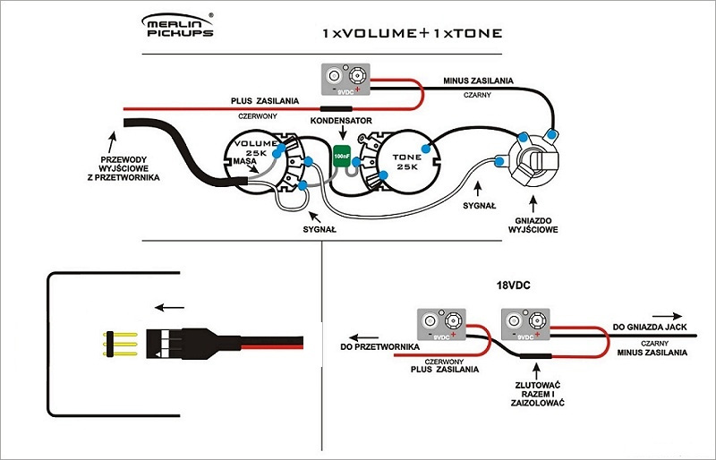 Przetworniki posiadaję wbudowanę elektronikę. W zestawie wraz z każdym przetwornikiem otrzymałem połęczone potencjometry, gniazdo jack itp - w układzie 1x volume i 1x tone.