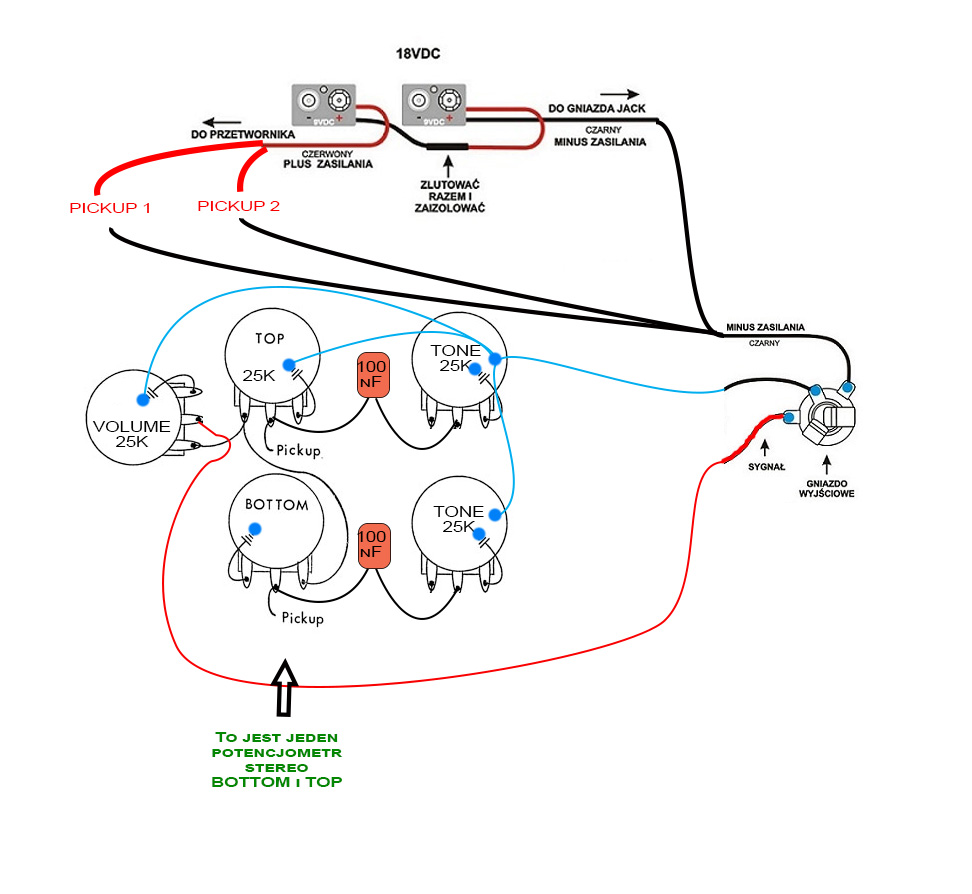 Mógłbym zamontowaę takie dwa zestawy i miałbym 2xvolume i 2x tone. Ale chcem inaczej :-) Zależy mi bardzo, żebym jednę gałkę mógł wyciszyę cały bas, żeby potem po zgłołnieniu na scenie nie musieę znów "szukaę" balansu przetworników. (przy obecnym układzie musiałbym łciszaę obydwa przetworniki osobno).