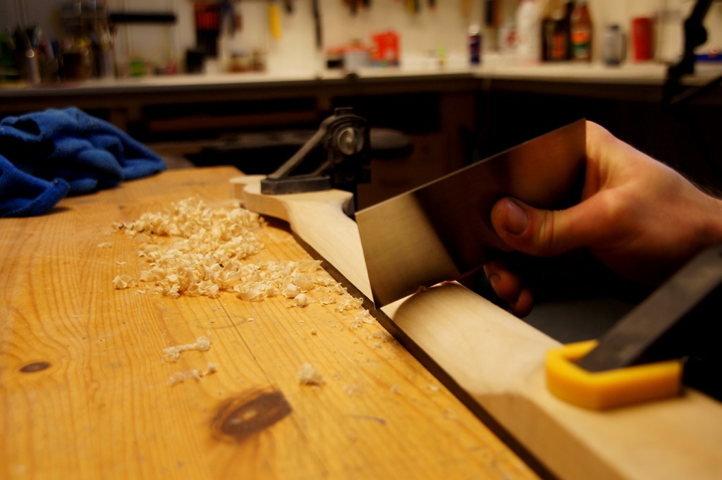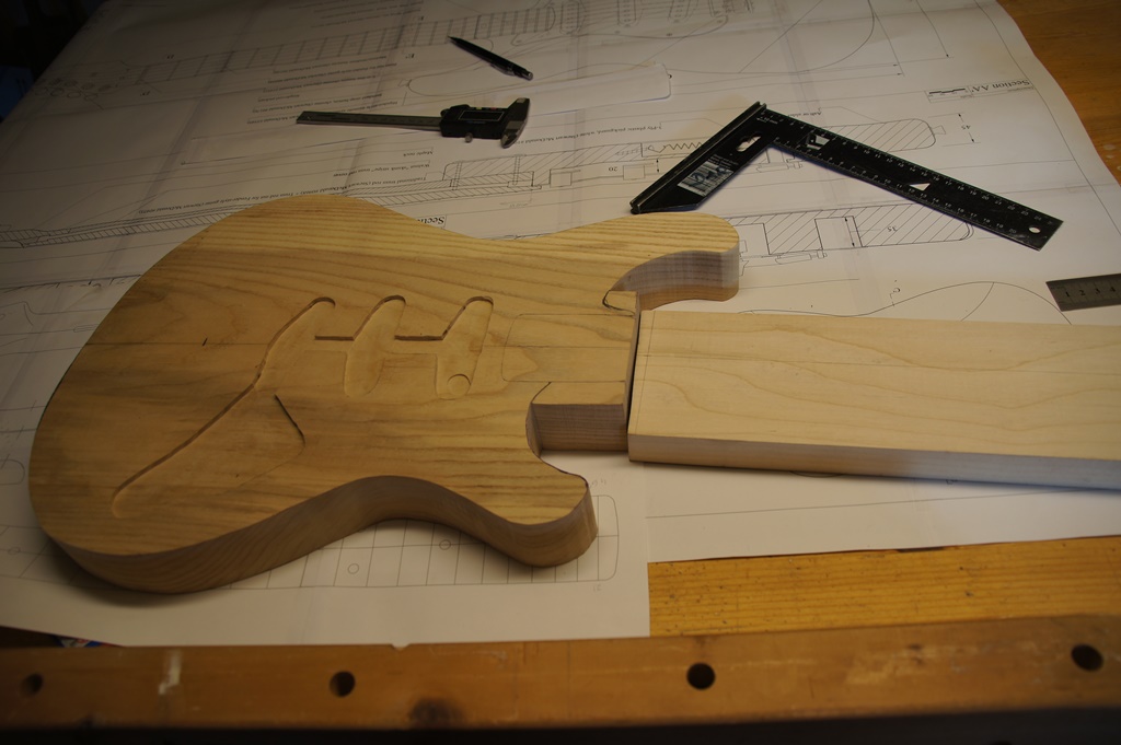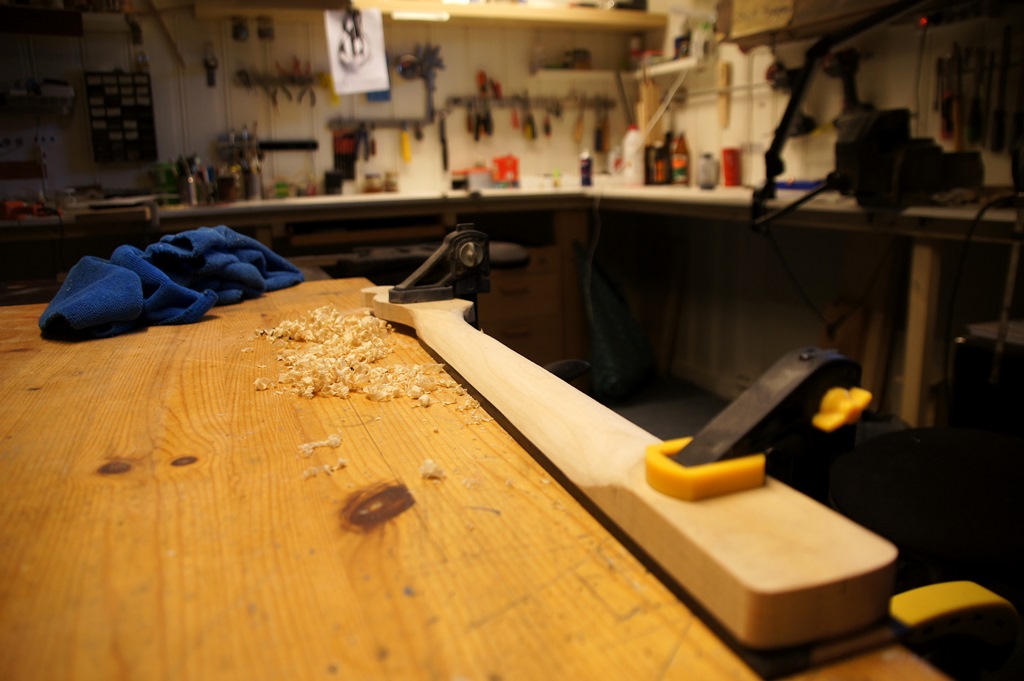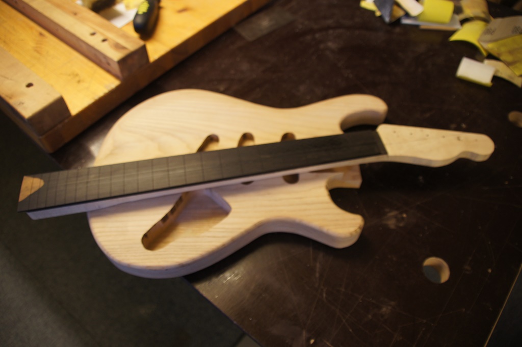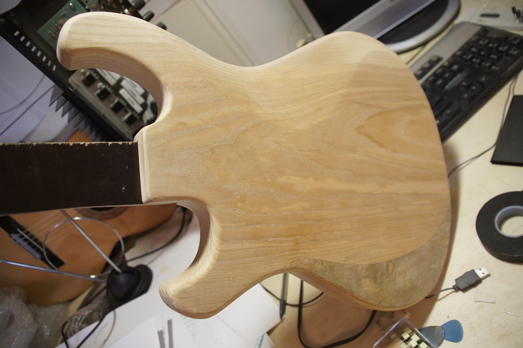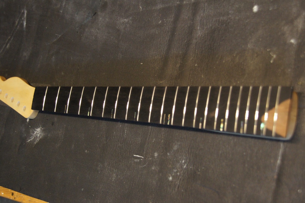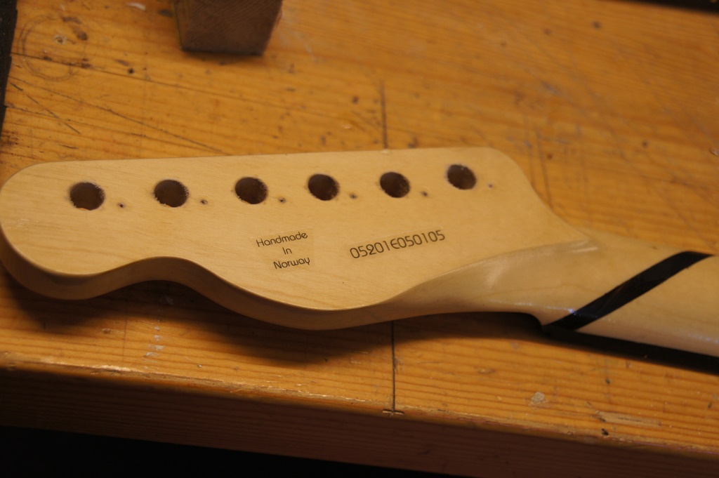 Ciekawostkę w tej gitarze jest bardzo gruba podstrunnica która ma 9mm. Owy grubas wymusił na mnie podzielenie kanału na pręt napinajęcy na 2 częłci, i tak częłę pręta chowa się w klonie a częłę jest podfrezowana w hebanie ;) Niestety nie znalazłem zdjęę jak wyględa frez w hebanie.
