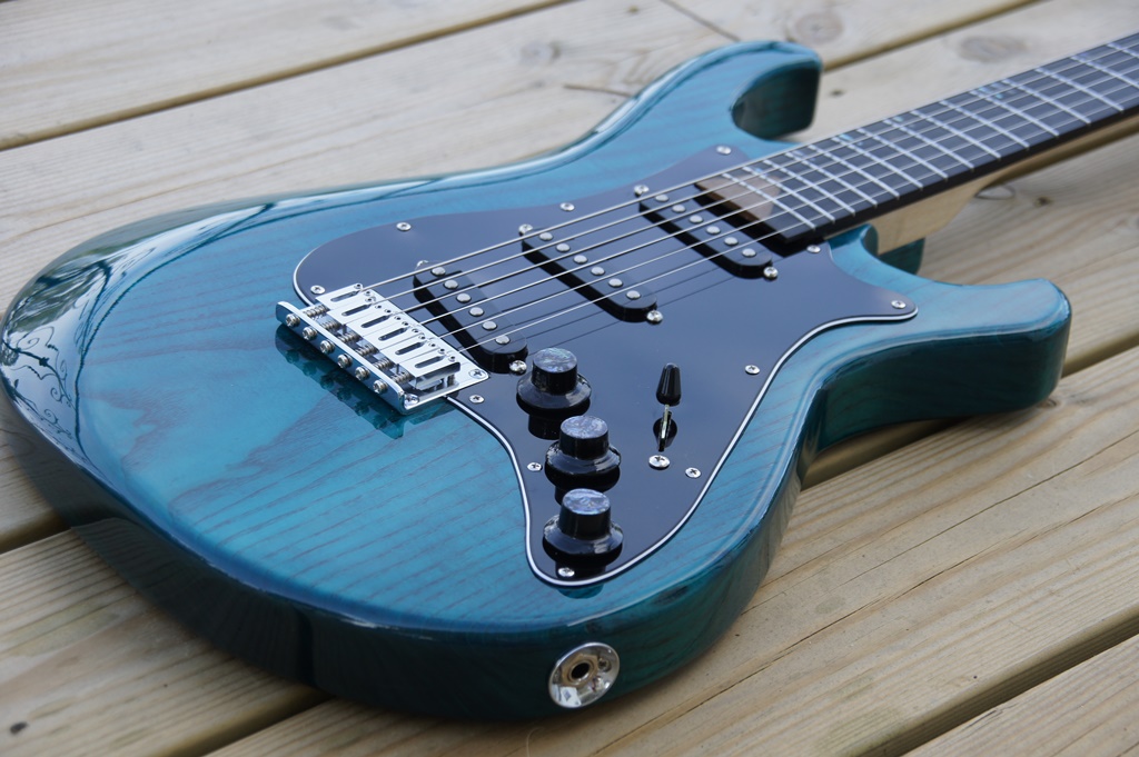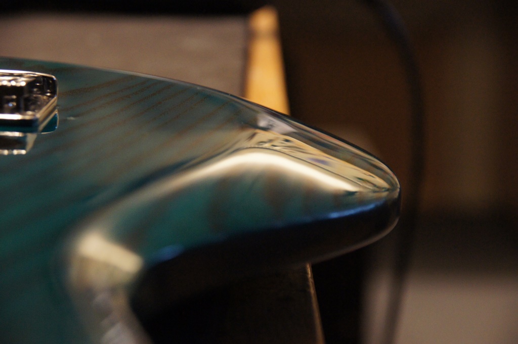 Ludi - Kawałek drewna w dolnym kancie to intarsja z falistej olchy grubołci 3 czy 4 mm (nie pamiętam dokładnie), nie jest to fornir. Zamysł był taki by jakoł ożywię plecy gitary i myłlę że wyszło na plus. Gałki są toczone z klonu , na wierch naklejony abalon, klon zabarwiony na czarno i całołę zalakierowana lakierem akrylowym z utwardzaczem. Gałki nie są super idealne ponieważ nie mam dostępu do tokarki i było one "toczone" z użyciem frezarki ale prezentuję się wg mnie fajnie, a fakt że nie są super idealne.. cóż to hande made ;)