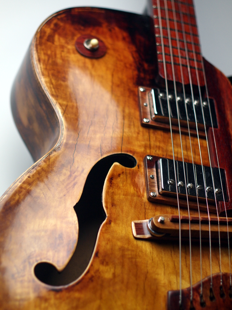 To był bardzo dobity i pokiereszowany niemiecki archtop kupiony za 300zł na a..gro. Zmian jest sporo, wywalone plastiki, których wszędzie było pełno. Zastępiono je drenem. Nowa podstrunnica, nowe okładziny na główce, nowa stopa gryfu i gniazdo (gryf osadzony był nie w osi). Nowy lakier (spirytusowy). Ta gitara na oko ma jakieł 50 lat, może więcej. Ma masą spękał, bruzd, dziurek, obię, przetarę.. ale mi to nie przeszkadza. Celem nie było zrobienie jej tak, by była jak nowa. Jest stara i ma zmarszczki. Mam ję od kilku ładnych lat i zawsze chciałem coś z nię zrobię, żeby zagrała, gra i stroi:)