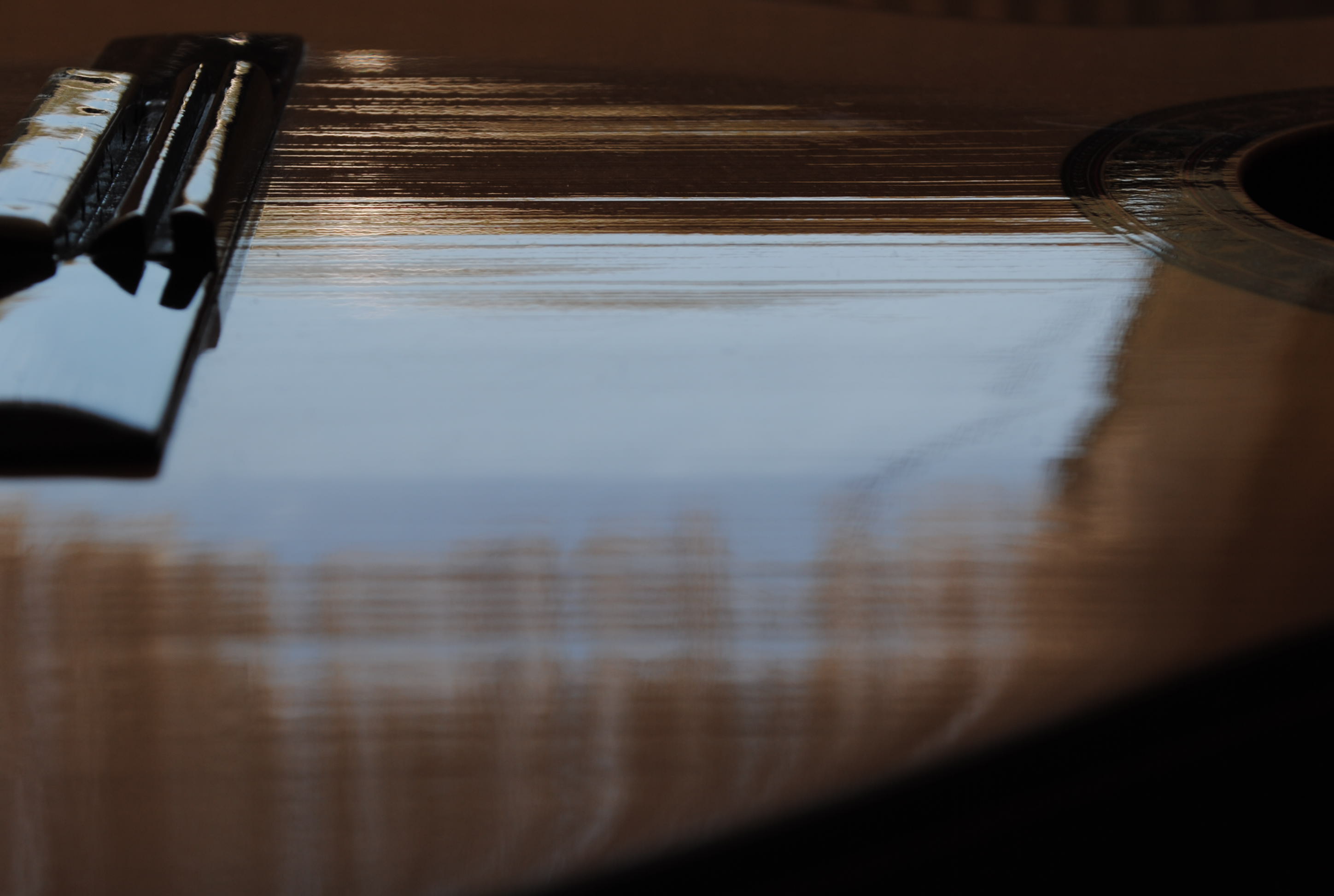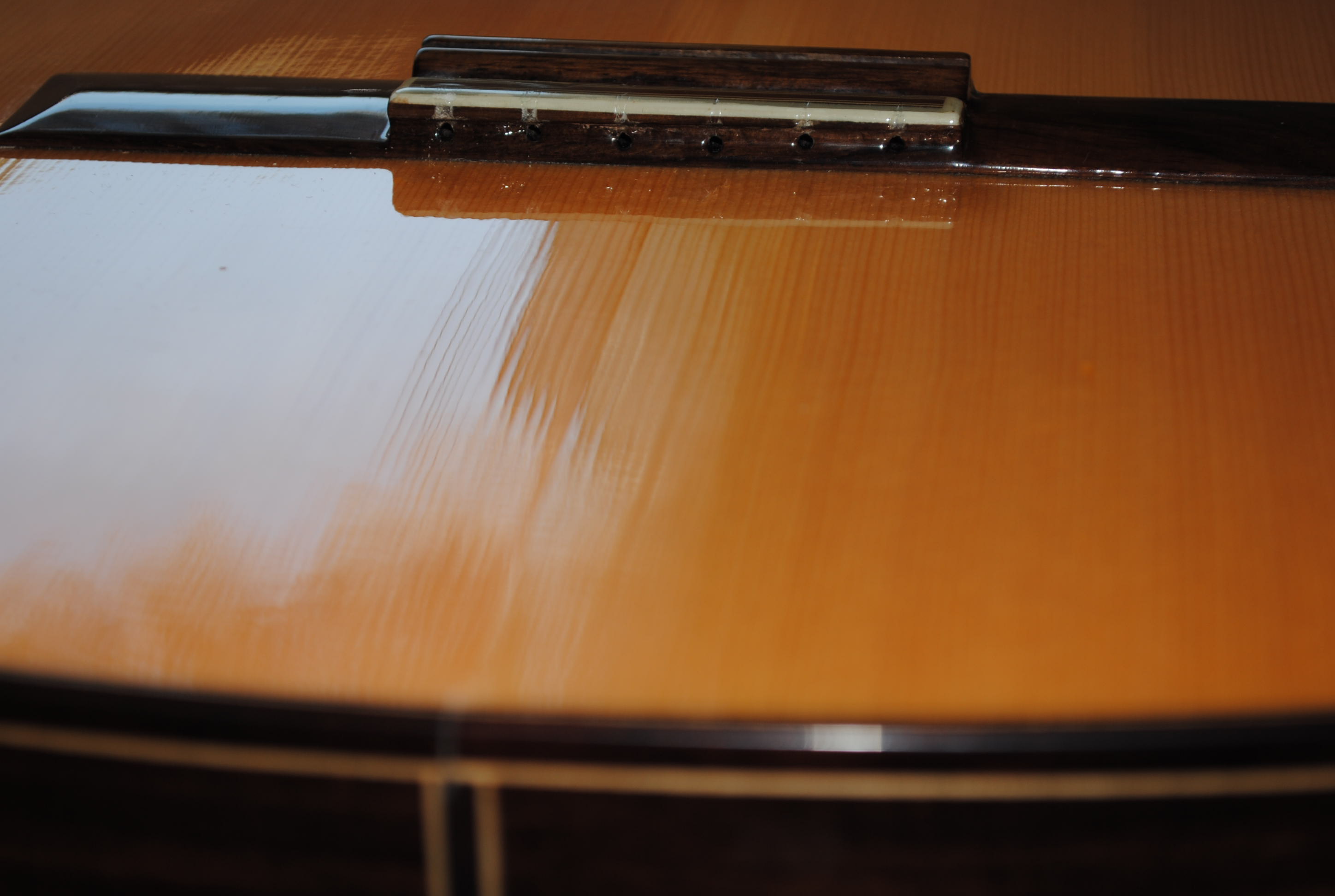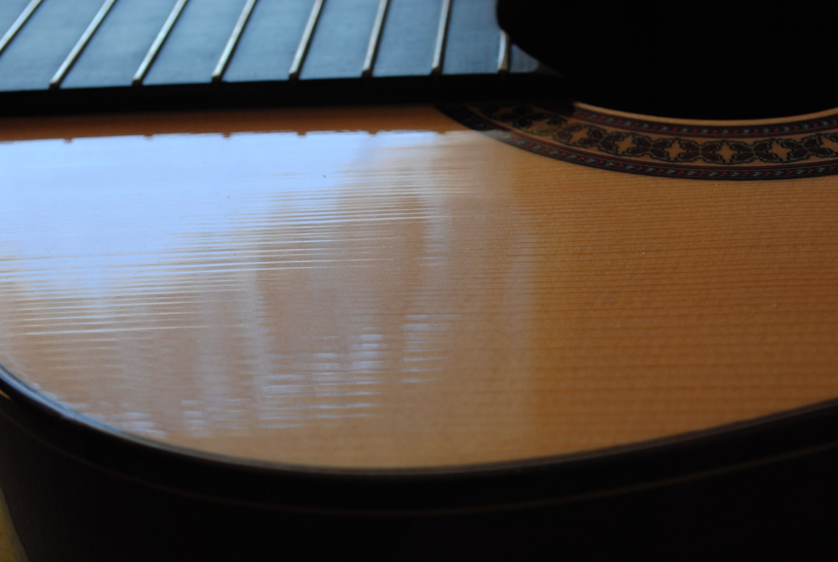 Poprzedni i jedyny właściciel po jej zakupie przez rok użytkował i nawilżał ale jak zapał minęł to przez trzy lata przeleżała w twardym futerale podczas zakupu byłem łwiadomy jej wysuszenia ale jak to Alhambra nie .. poddała się ... lakier nie popękał progi i gryf w idealnym stanie może przez wzmocnienie hebanowe , jedynie to uległa odkształceniu płyta wierzchnia pokazał się garb w okolicy 14 progu a przede wszystkim faktura płyty wierzchniej nabrała kształtu falistego odpowiadajęcemu słojom drzewa czyli standartowy objaw przesuszonej gitary.