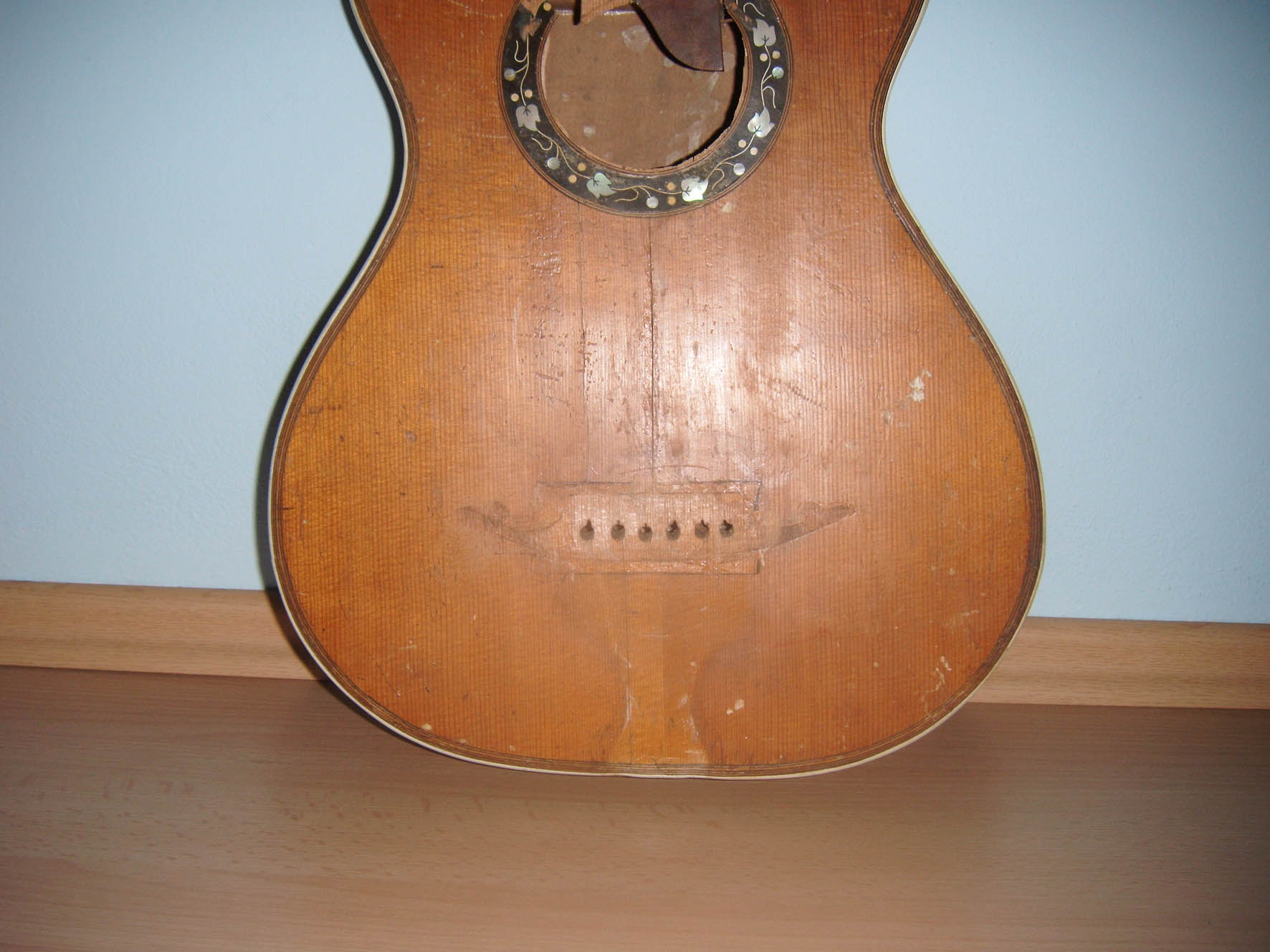 Nie mam pojęcia czy tak lutnikowi wyszło czy jest to zamierzony efekt. Brakuje mostka, jednak wyraęšłny łlad po nim pozwolił mi graficznie odtworzyę jego charakterystyczny kształt. Widaę również że gitara miała póęšłniej dorobiony inny mostek bo jego łlad również się odcisnęł. Dziwię mnie te otwory po kołkach bo ta gitara pierwotnie zbudowana była niemal na pewno pod struny jelitowe (nylonowe). Ta piękna rozeta wokół otworu rezonansowego budzi podejrzenia, że nie jest to jakił tani wyrób dawnego rzemiosła. Moję ambicję jest przywrócię do życia ten uroczy instrumencik. Będę wdzięczny za pomoc w ustaleniu co to za gitara i gdzie szukaę odpowiednika na którym można by się wzorowaę.