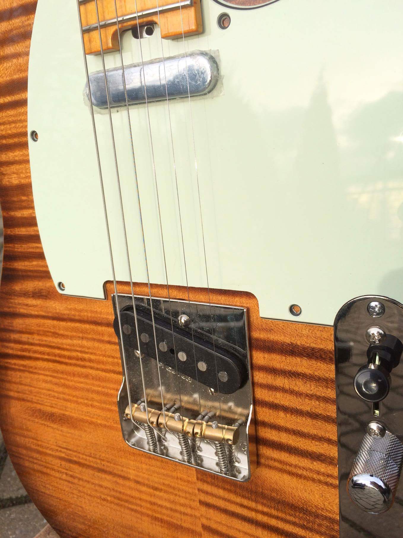 Witam, prezentuje dził kolejna gitarę, tym razem jest to tele. Jesionowy jednoczęłciowy korpus z klonowym topem 6mm. Gryf jest w całołci z klonu pawie oczko. Most gotoh, klucze blokowane gotoha z regulowanę wysokołcię trzpieni, pickupy Fender nocaster.