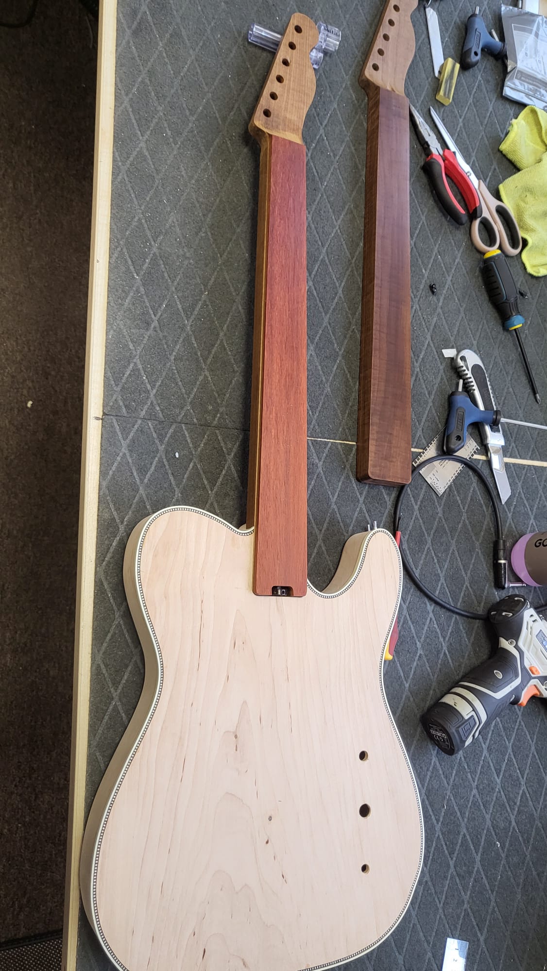 Gryf już prawie skończony, pozostało progi nabić, Korpus przygotowany do malowania.